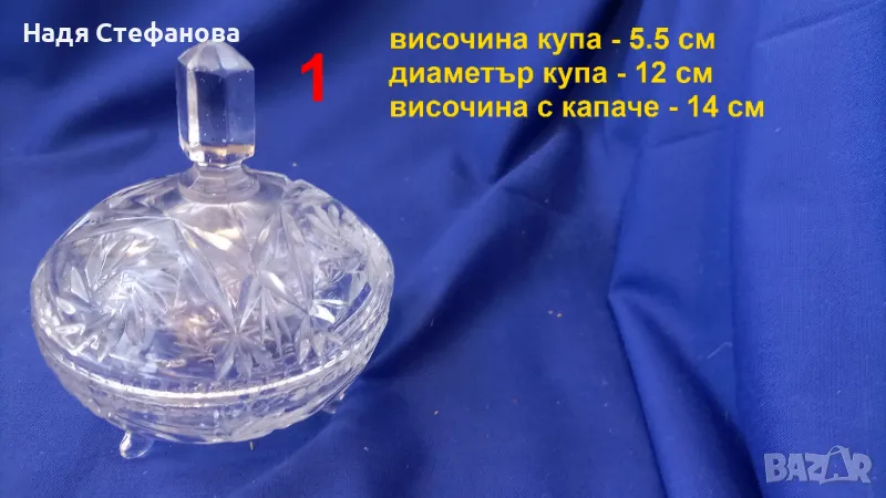 Прочетете моля много внимателно поясненията към обявата. Ако след прочитането нещо все пак не е изяснено, задавайте въпросите си тук чрез съобщение или на посочения телефонен номер. По принцип през деня съм в движение и е по-сигурно да мога да отговоря по телефона след 18 ч. При изменение редактирам обявата навреме. Ако направо харесвате нещо от обявата, директно може да го поръчате. Красота и стил. Нямат забележки. Не са и ползвани по предназначение. До сега само красяха витрината. Цената на бонбониерата с капачето е 26 лв, а на голямата цената е 44 лв. За двете цената ще е 60 лв и това е отстъпката. Изпращам добре опаковано от мен по Еконт с опция преглед и евентуално тест преди да се плати. НЕ ИЗПРАЩАМ ПО СПИДИ!!! Куриерската услуга е