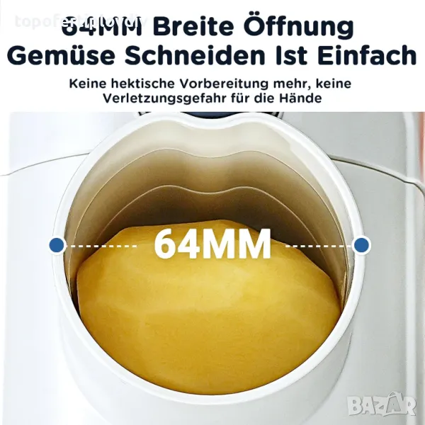 Ефективно рязане: Захранван от 80 W DC мотор с висок въртящ момент, нашият нож за зеленчуци реже различни съставки без усилие и ви спестява време и енергия. С 64 mm широк вал за пълнене, електрическото ренде за сирене побира цели зеленчуци като картофи, краставици и моркови, докато 83 mm изход осигурява по-бързо изпразване за по-голяма ефективност.