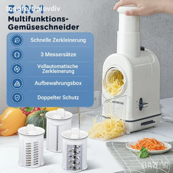 Гъвкава функция: нашата електрическа 3-в-1 резачка за зеленчуци, електрическа, разнообразни съставки с лекота. Оборудван с три сменяеми остриета - грубо парче, фино парче и нарязване - той нарязва без усилие зеленчуци, плодове и дори твърди съставки, предоставяйки безкрайни възможности за вашите кулинарни творения.