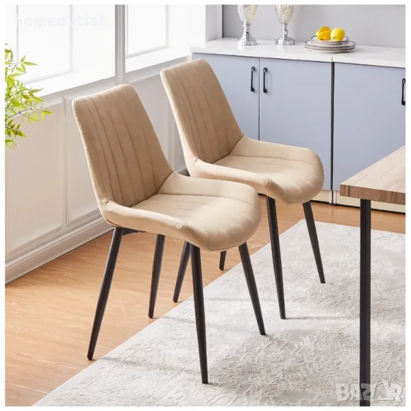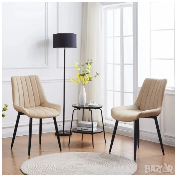 Дизайнът на столовете се отличава със съвременен силует с плътен гръб и елегантни заострени метални крака в контрастен цвят.