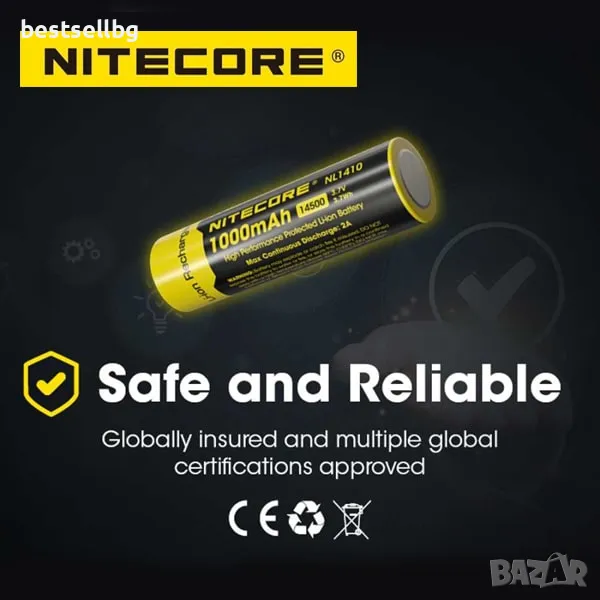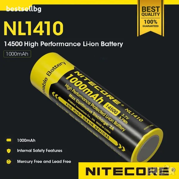 Nitecore NL1410 е най-новата литиево-йонна батерия 14500, отличаваща се с впечатляващ капацитет от 1000 mAh и 3,7 V. Клетката е предназначена за високоефективни фенерчета и има защитна верига за защита срещу презареждане, преразреждане и късо съединение.