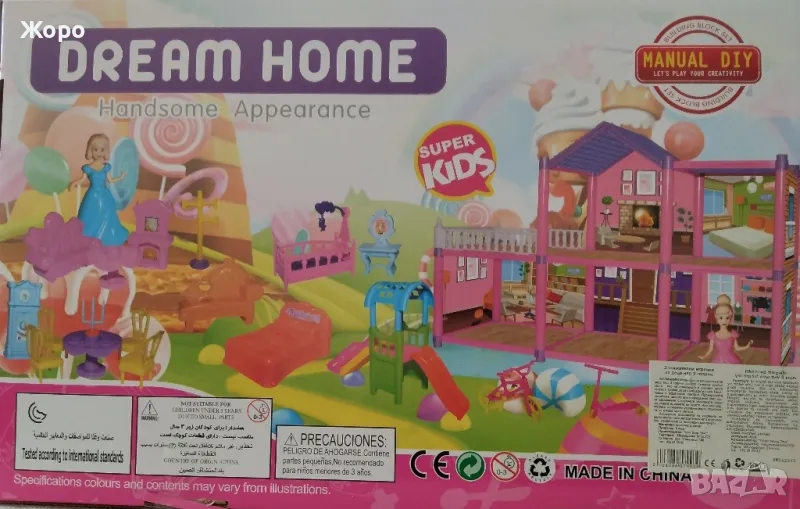 Комплектът включва елементи за изграждане на къща, картонени елементи с отпечатан декор, мебели за дома, 2 принцеси. Размер на опаковката 39 х 7,5 х 25 cm.