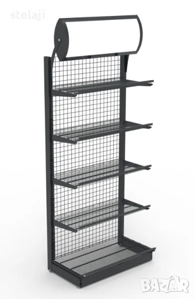 Островния стелаж може да бъде с челни стелажи със заоблени рафтове в двата края, силно устойчиви и издръжливи на натоварване.