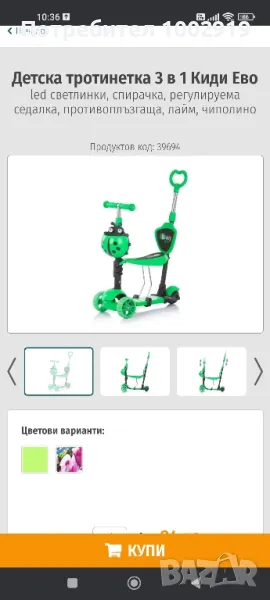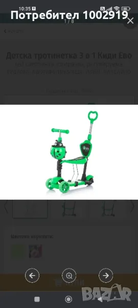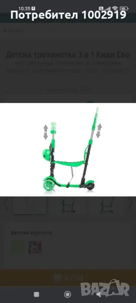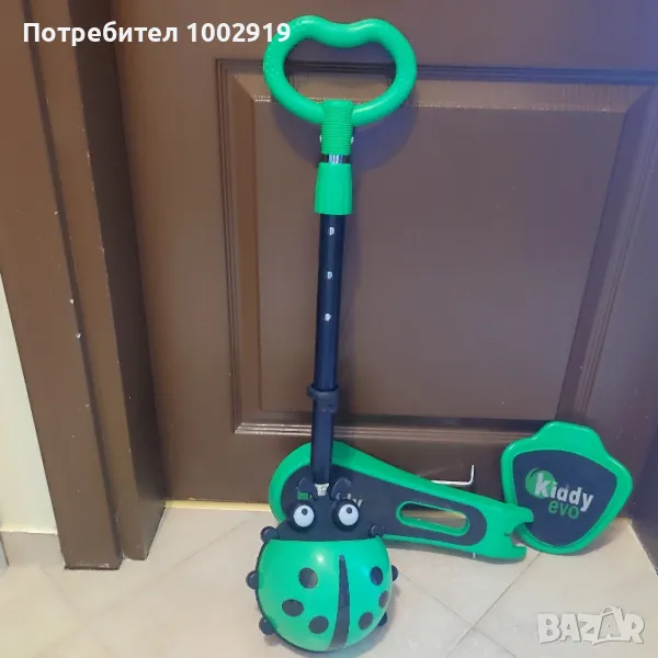 Скутер: Отстранете седалката от рамата на играчката. Детето се хваща с двете си ръце за кормилото, стъпва с цялото стъпало на единия си крак върху основата на играчката, а с другия се избутва.