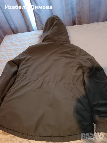 Якето е зелено. Има връзки на кръста за регулиране на талията. Пуха от качулката се маха. Отвътре е с бял пух. Без забележки.