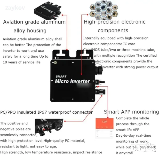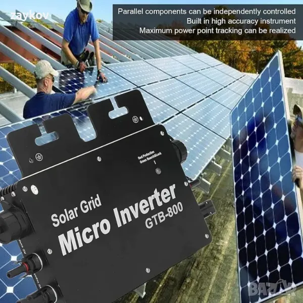 соларен инвертор Микро инвертор IP65 Водоустойчив AC изход 120V/230V инвертор//Спецификации: Име: Микро инвертор Материал: Алуминиева сплав + Електронни компоненти/>Модел: GTB-400/ 600/ 700/800W/>Приложима сцена: система за генериране на слънчева енергия (външно тъпо)./>Използване на продукта: оборудване за генериране на слънчева енергия/>Тегло: 1,5 kg/>/>Режим на изходно напрежение />Максимална входна мощност: 800W/>MPPT проследяване напрежение: 22-50V/>Минимално/максимално напрежение при стартиране: 22-50V/>Къс ток -Максимална постоянна верига: 20A/>Максимален работен ток: 18A/>Изходни настройки: @120V @230V/>Максимална изходна мощност: 800W 800W /> Номинална изходна мощност: 800W 800W/> Номинален изходен ток: 3.3A 1.7A/> Номинален обхват на напрежението: 80-160VAC 180-280VAC/>Номинален честотен диапазон: 48-51 Hz/58-61 Hz />Брой единици свързани с въже: 6 единици 1 2 единици/>/>Характеристики:/>- Соларен контролер за зареждане Интегриран с проследяване на максимална мощност. />- Входът и изходът на микроинвертора са напълно изолирани, което го прави по-безопасен и надежден за използване. Високопрецизните електронни компоненти осигуряват силна изходна мощност на инвертора - IP65 водоустойчив конектор, висока устойчивост на светлина, устойчивост на удар, не е лесен за стареене