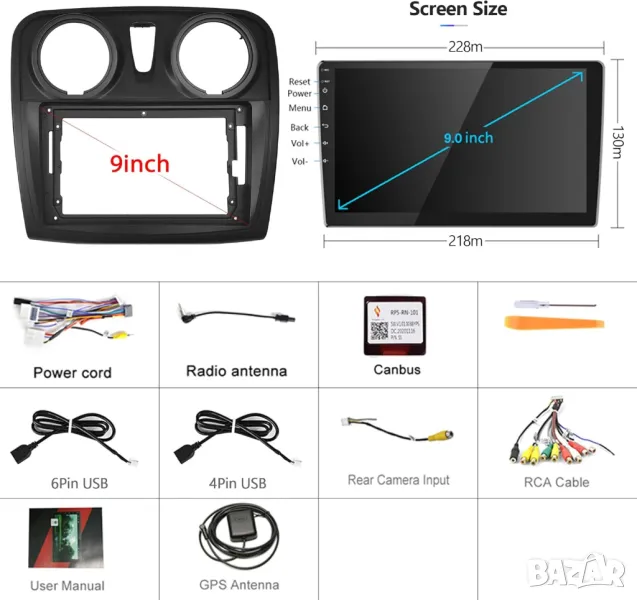Пълен комплект с цялата рамка, преходни кабели и букси, декодери, предназначени и съвместими за монтиране на конкретния модел автомобил.