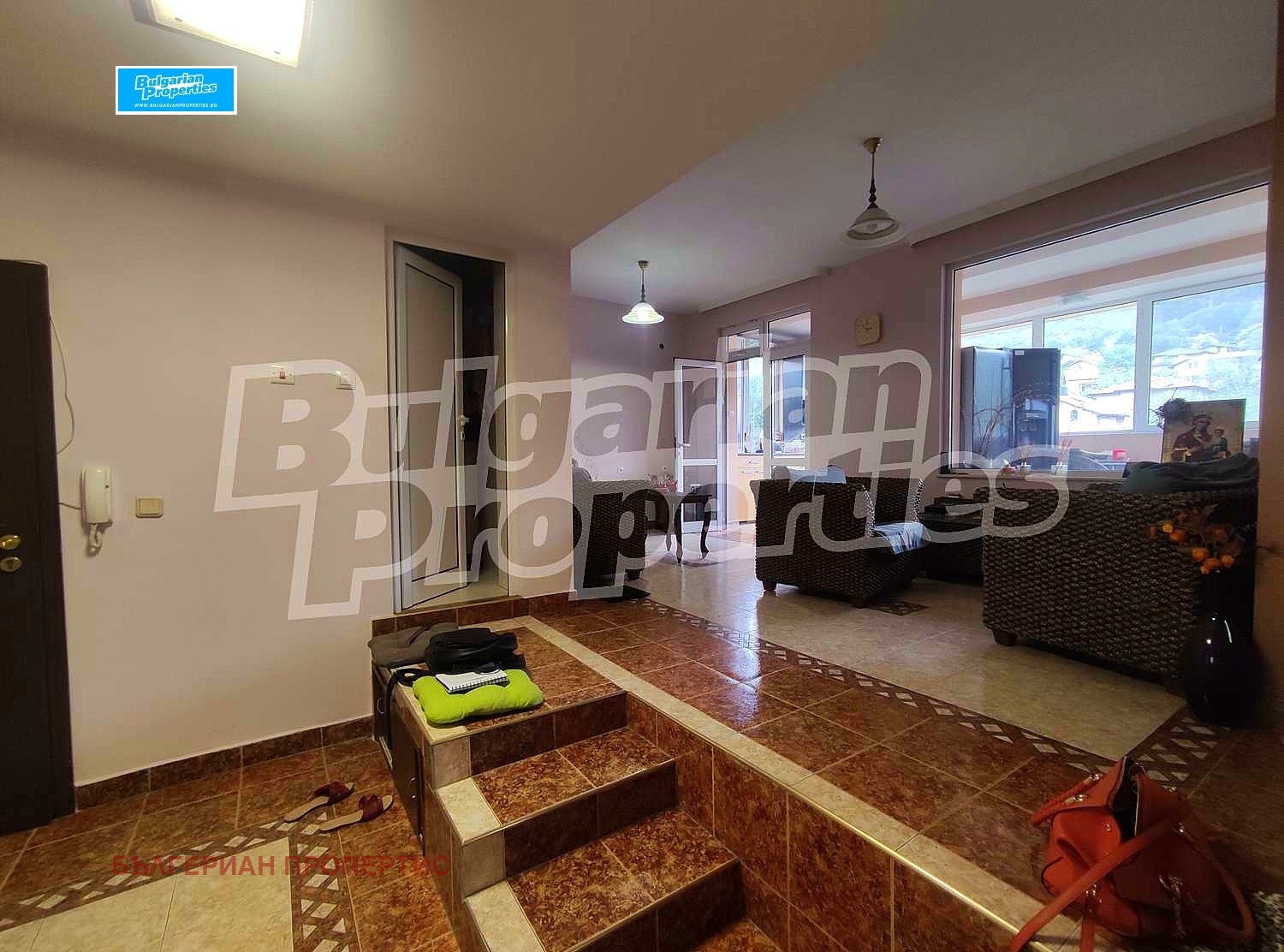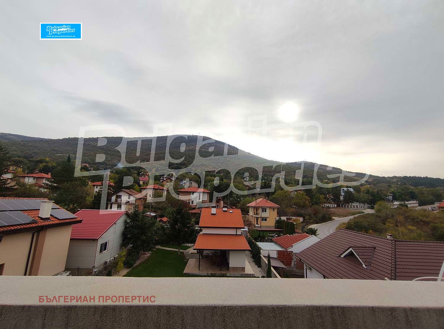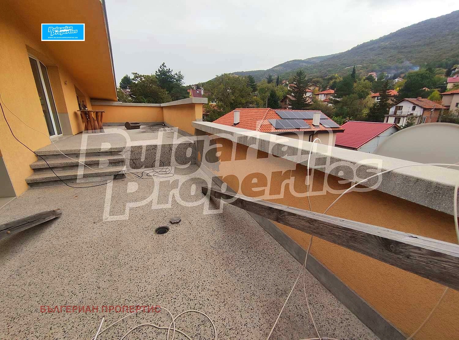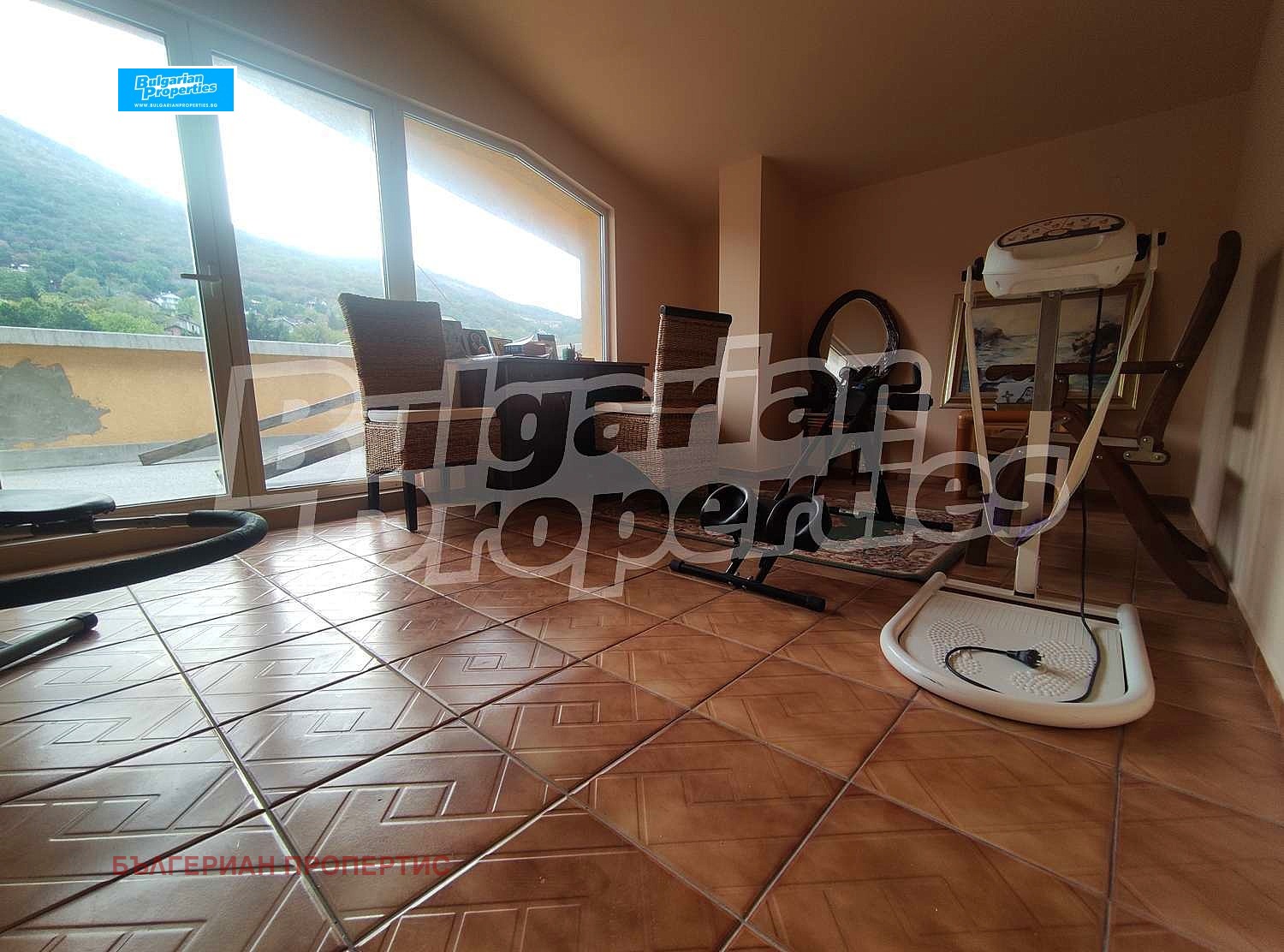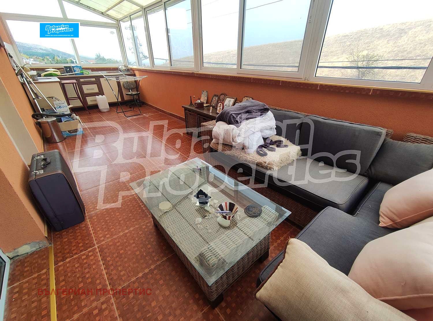 Втори етаж - 2непреходни спални; хол с преход към обособена южна тераса, затворена с дограма и оборудвана с кухненски бокс, кът за кафе, място за хранене, с гледка към планина; северна тераса, също с направен кухненски бокс и изцяло затворена с дограма, с гледка планинско възвишение; баня с тоалетна в едно с душ-кабина