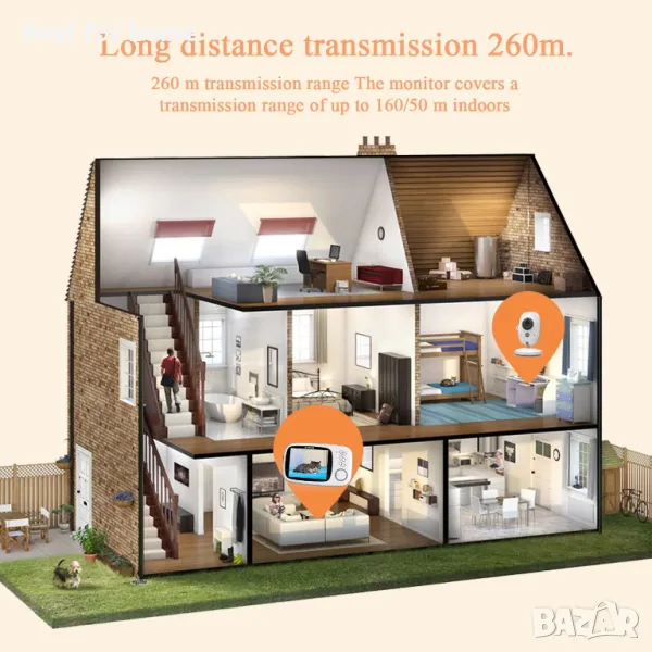 � � Използвайки най-новата технология за предаване на 2,4 GHz FHSS (не се изисква WiFi), този безжичен бебефон с камера защитава поверителността на вашето бебе от хакери. 260 м (853 фута) бебефон с голям обхват ви позволява да готвите щастливо долу, да се наслаждавате на слънцето край басейна.