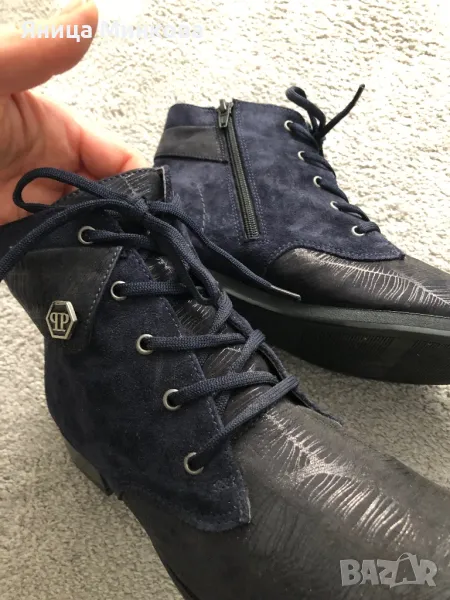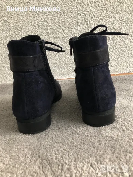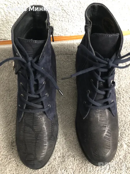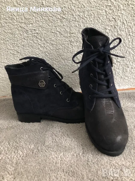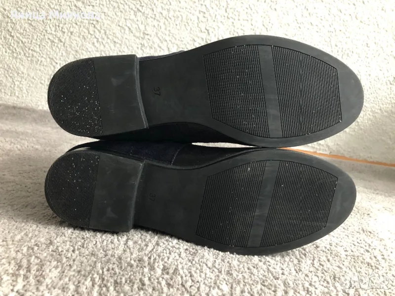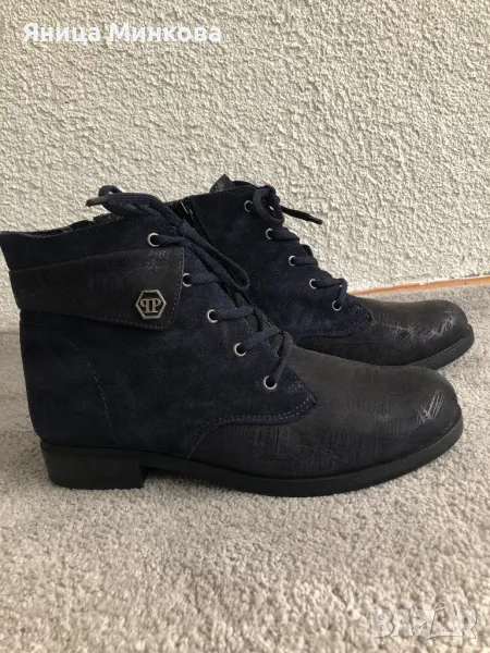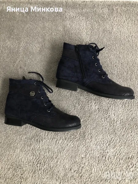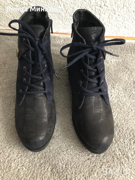В отлично състояние, без следи от употреба. Цвят- тъмно син. Модела е уголемен и отговаря на номер 38. Стелка- 24 см. Произведени в България. Обувани са 2 пъти. Изпращам с преглед и тест.
