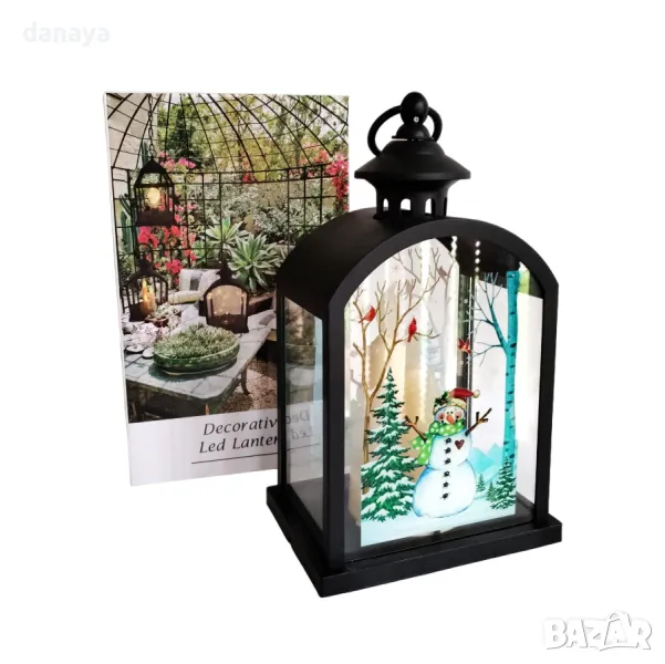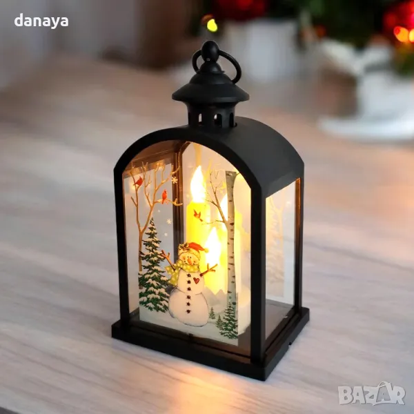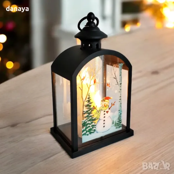 5353 Декоративен Led фенер лампа с реалистични свещи и картинка Снежко, 28 см