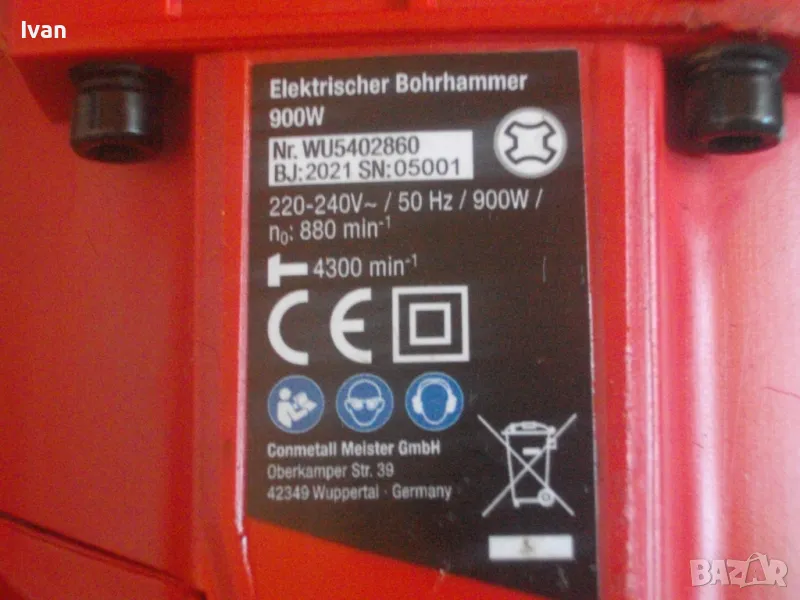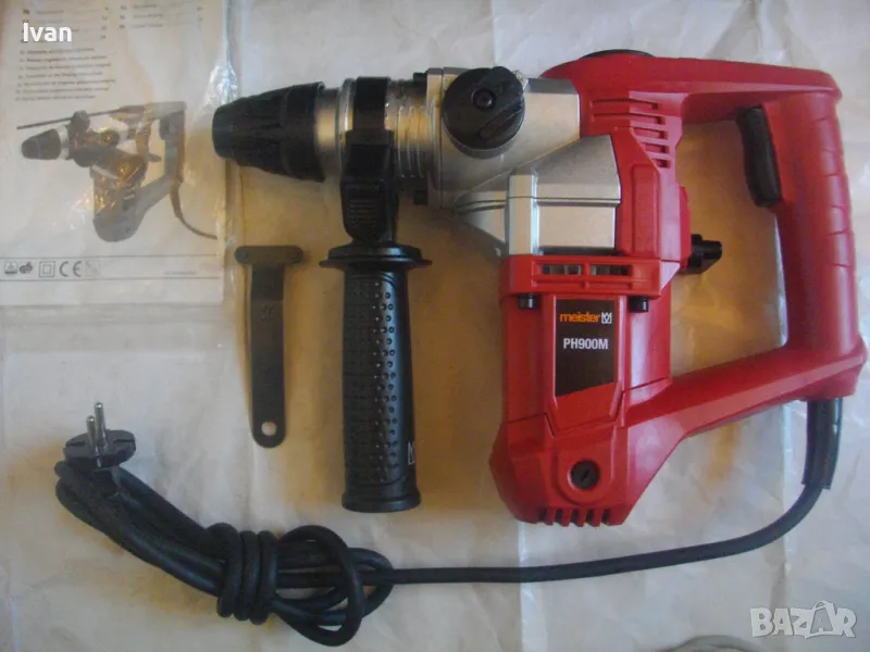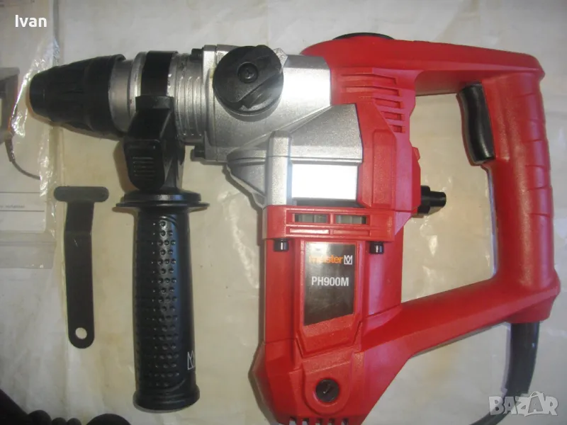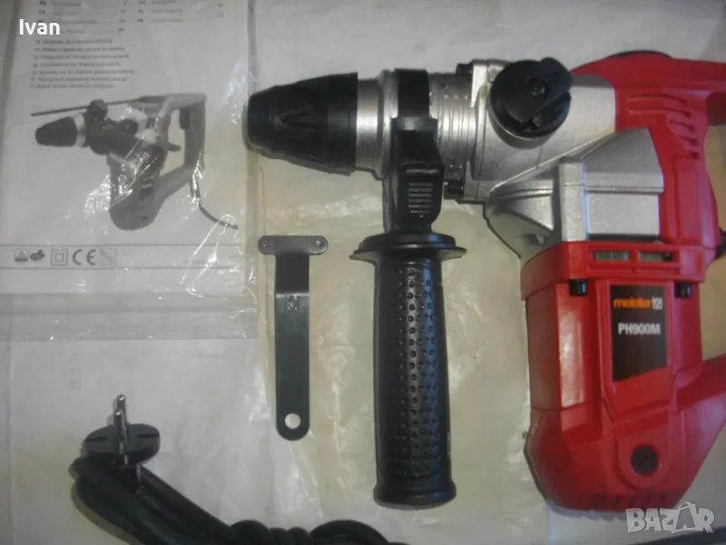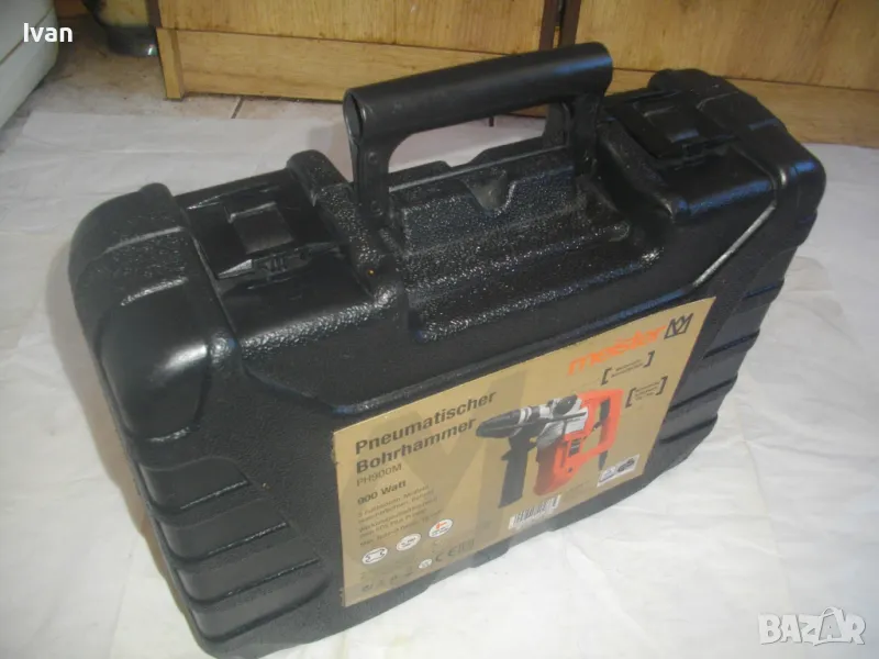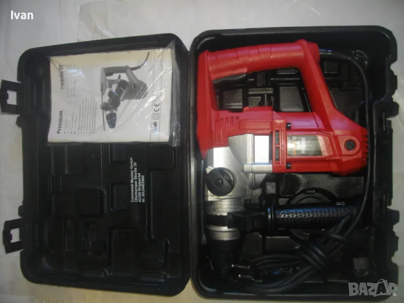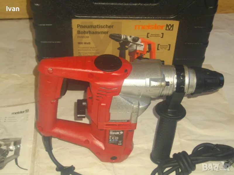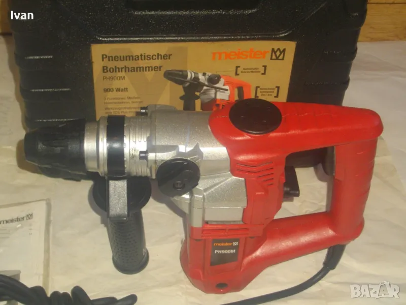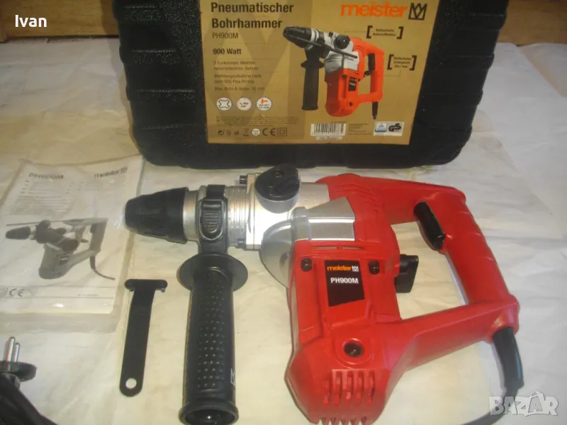 ОПИСАНИЕ на 900 ватов немски електрически перфоратор къртач. Цена 299 лв. Почти нов, като нов, отлично работно състояние. Без искрене от нива четки - ротор, без смущаващи вътрешни шумове, без луфтове. Марка и модел Meister PH900M. Производство маркирано - оригинално Германия Germany 2021 г. Мощност 900 вата, скорост при удар 4 300 трептения в мин, скорост при пробиване 880 об/мин. Патронник SDS Plus стандартен. Четки външни. Стоманен корпус. Предна оригинална бързоснемаща се дръжка с клик-клик система. Наличен оригинален ключ в куфара. Оригинален куфар на марката с лого. Размери на машината - 340 х 255 х 8 мм. Оригинални книжки указания в комплекта. Тегло на машината 4,0 кг. Тегло с куфара - 6,0 кг. Цена на комплекта - 299 лв.