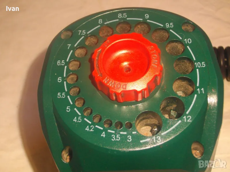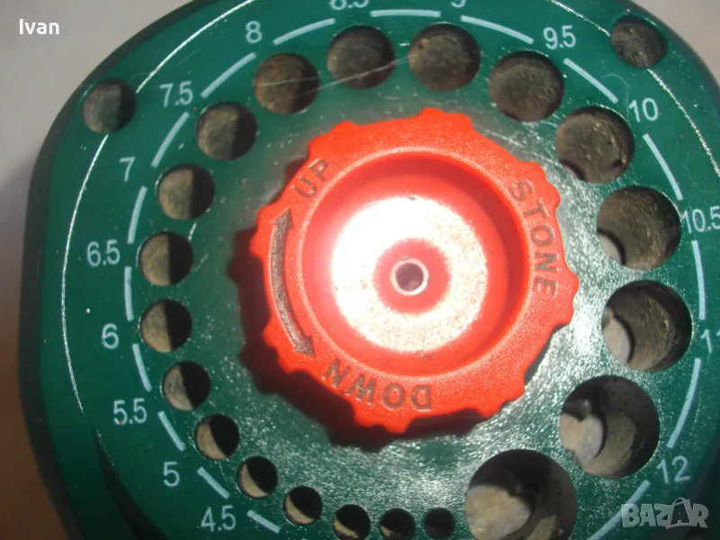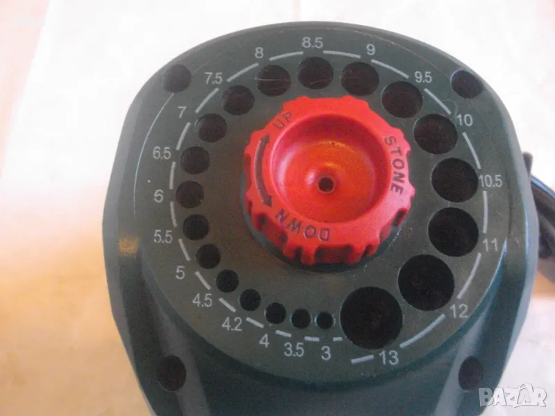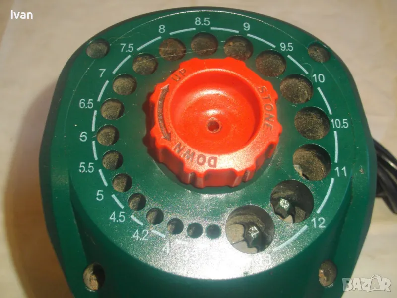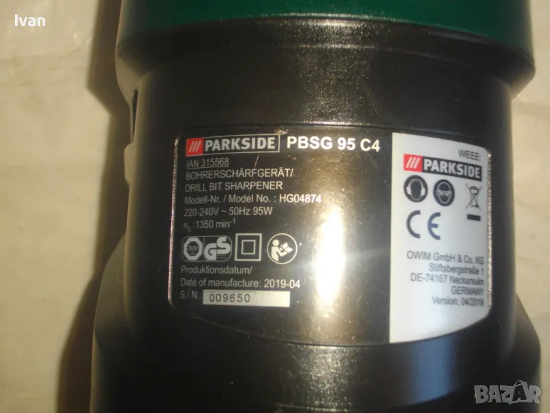 ОПИСАНИЕ на зелена електрическа машина заточваща точило за бургии до ф13 мм включително - цена 199 лв. Немска оригинална на Парксайт, непредлагаща се в България /до 13 мм/. Марка и модел на машината Parkside PBSG 95 C4. Germany - Neckarsulm 2019 г. Запазен външен вид и отлично работно съсотяние. За заточване на бургии размери от ф3 мм до ф 13мм всички размери, общо 20 дупки за заточване. Мощност - 95 вата, скорост 1350 об/мин. Преден пусков ключ. Височина на машината 175 мм, ругилация на затягането на поставена бургия за заточване. Тегло - 2,0 кг. Цена 199 лв.