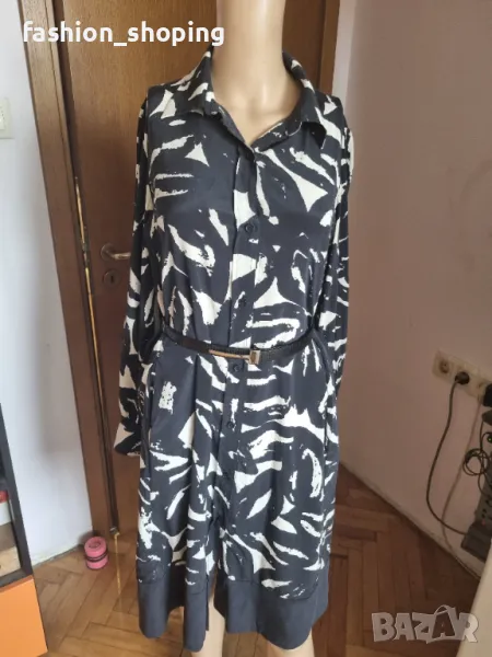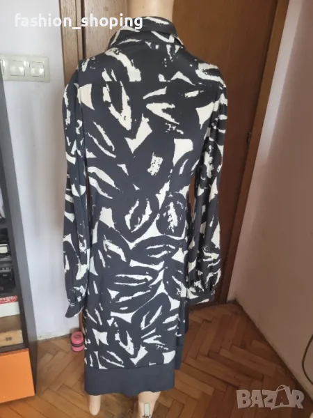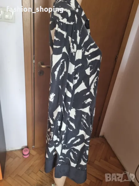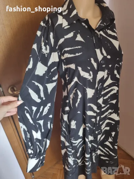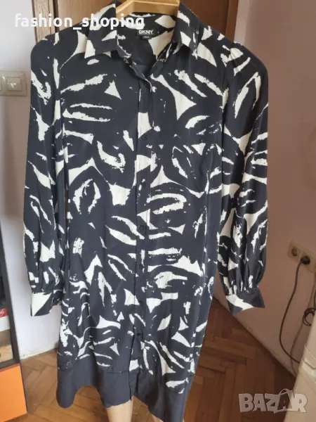Красива рокля,тип риза в непреходните цветове черно и бяло.От естествена лека и луксозна материя,каквато е коприната. С много красив буфан ръкав. Брандирани копчета.Кройката е свободна, с вътрешни джобчета за удобство.Чудесно се съчетава с кецове за по-спортна визия. С колан на талията стои елегантно и може да се комбинира с обувка на ток. Роклята е подходяща за високи дами предвид дължината си.