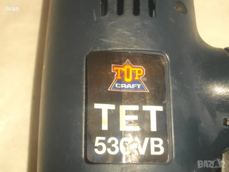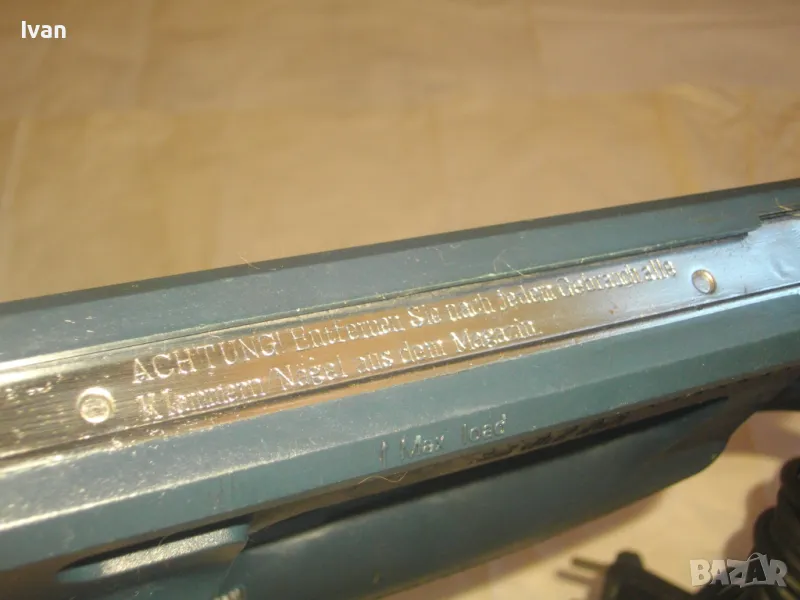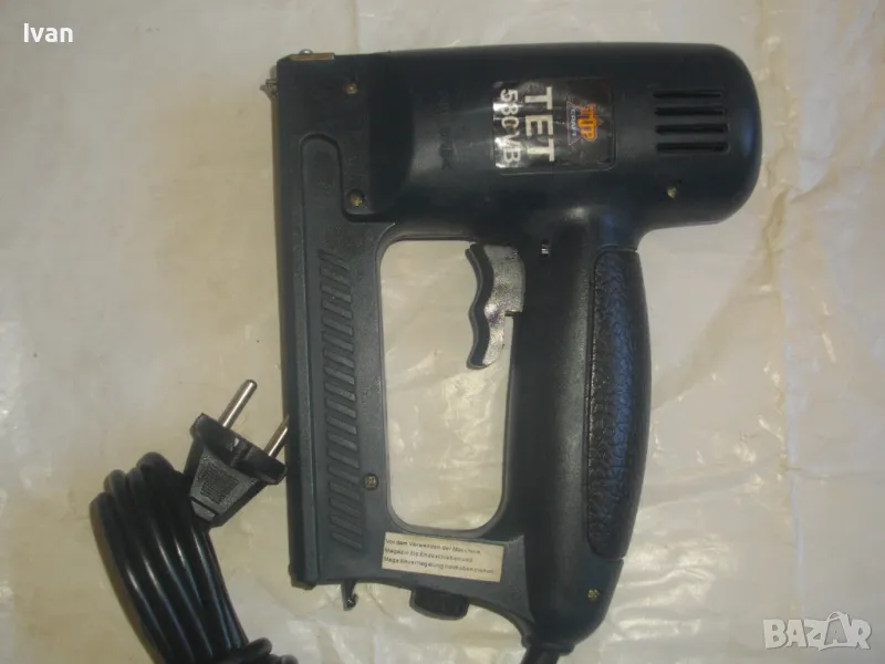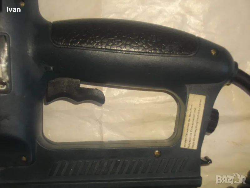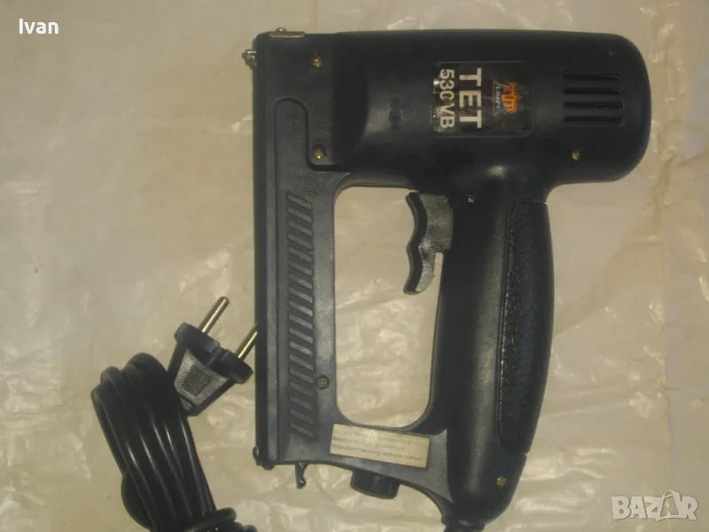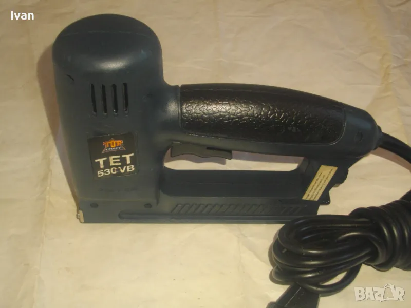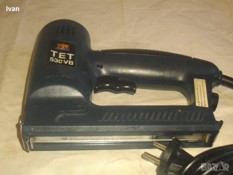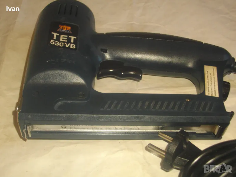ОПИСАНИЕ на елктрически син дърводелски тапицерски такер комбиниран за скоби и пирони - цена 159 лв. Марка и модел Top Craft TET 530VB. Запазен външен вид и отлично работно състояние на машината. Производство на машината оригинално немско Germany. За скоби тип 53 универсални 8-14 мм и пирони тип J размер 8-16 мм. Регулация на удар, заключване на спусъка. Заредени скоби в пълнителя за проба и тест. Релефно нехлъзгащо се покритие на дръжката. Тегло на такера - 1,9 кг. Цена 159 лв.
