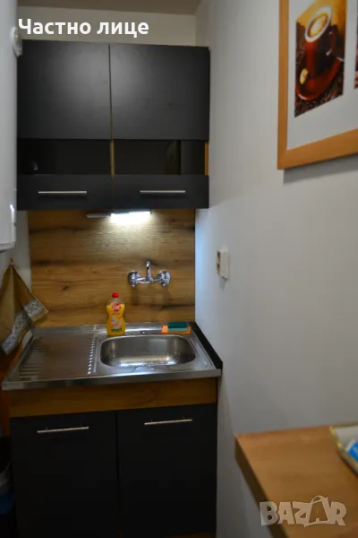 Кухненски бокс с мивка и шкафове, хладилник и зона за топли напитки. Без фурна, котлони или микровълнова.