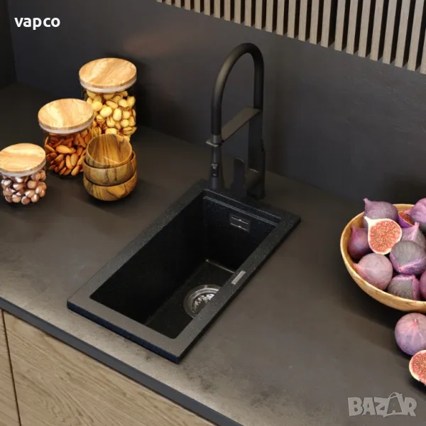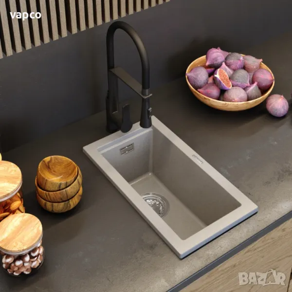 Гранитната мивка е продукт, чийто неподвластен на времето и най-вече универсален външен вид предоставя много възможности за дизайн. Неговата форма и размер може лесно да се адаптира към кухненския интериор, така че да се насладите напълно на неговите възможности.Поддържаните пропорции не затрупват интериора, а минималистичната форма ви позволява да въведете елегантна хармония в кухненското пространство. Дизайнът на модела включва възможно най-голямата купа, която осигурява комфорт при ежедневно миене и го превръща в удоволствие. Индивидуалното персонализиране ви позволява да поставите допълнителни отвори в повърхността на мивката, които са предназначени за дозатор за течност или копче за автоматичен сифон. Благодарение на това можем да създадем комплект, който да отговори на очакванията и на най-взискателния клиент.