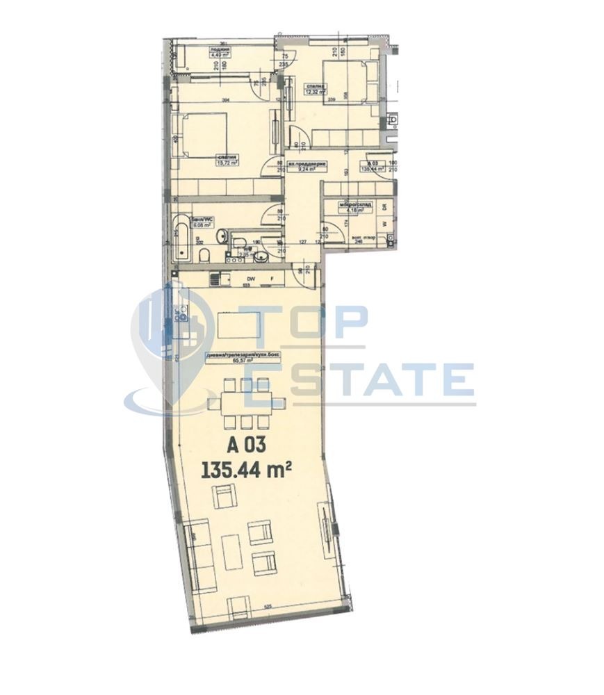 Топ Естейт Недвижими имоти Ви предлага тристаен апартамент в квартал Бузлуджа, гр. Велико Търново. Апартамента е разположен на първи висок жилищен етаж в ново построена жилищна сграда. Общата площ на имота е 149, 89 кв.м, като чистата жилищна площ е 135,44 кв.м, разпределени по следния начин - коридор, мокро помещение, дневна с кухненски бокс, две спални, баня с тоалетна, тоалетна и лоджия. Жилището има блиндирани входни врати, шесткамерна PVC дограма-златен дъб, външна топлоизолация и луксозно изпълнение на общите части. Номер на оферта: 2865. We speak English and German.