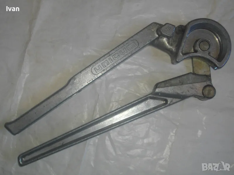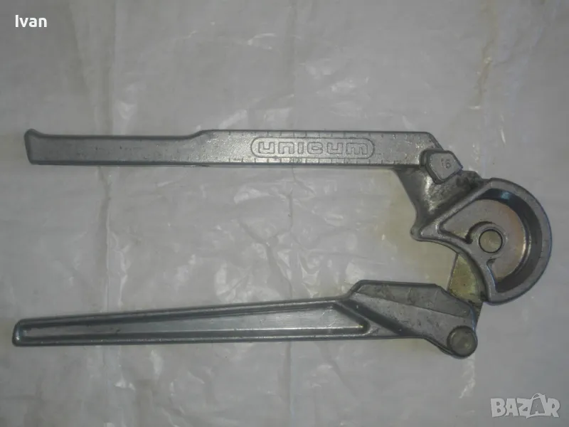 ОПИСАНИЕ на тръбогиб UNICUM ръчен уред за огъване на тръби размер диаметър до ф 16 мм - цена 299 лв. Оригинален немски, масивен, изцяло от алуминий. Професионален, индустриален, промишлен. Помти нов, отлично работно механично състояние. Цялостна дължина 430 мм, ширина 170 мм.Разграфена дръжка до 100 мм. Радиус на огъване 45 мм. Тегло на тръбогиба - 2,0 кг. Цена 299 лв.
