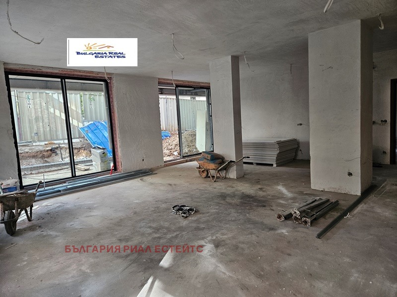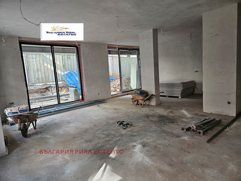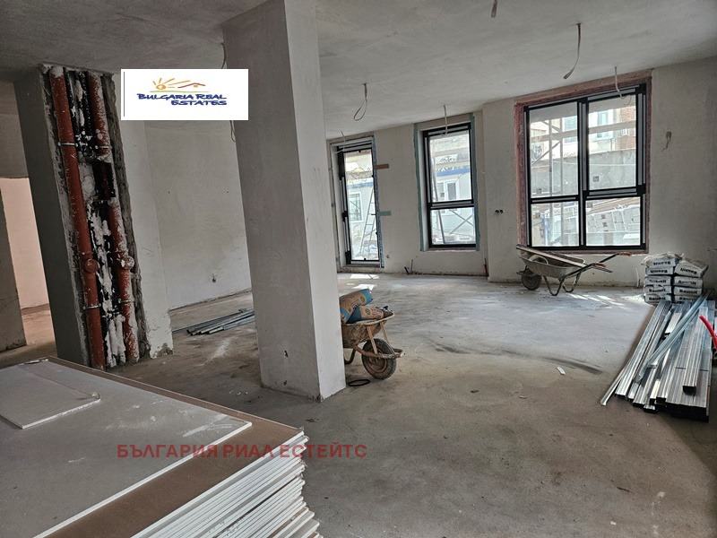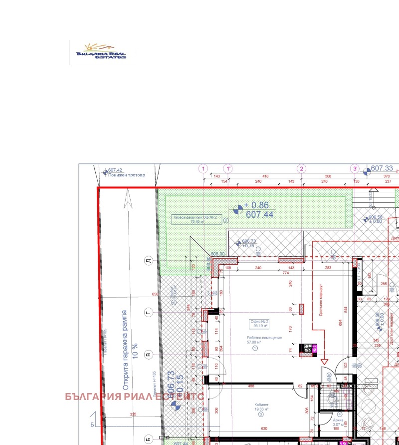 Офиса е със следното разпределение: антре, тоалетна, кабинет, помещение за архив, работно помещение от 57 кв.м., тераси към всички помещения и двор от 75 кв.м.с излаз от всички помещения.