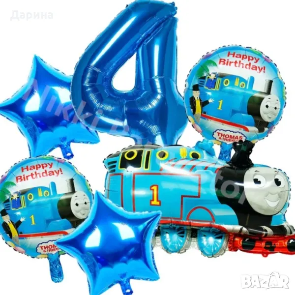 Парти сет балони Влакчето Томас - 6бр. балони: 1бр. влакчето Томас 66/52см., 2бр. звезди 45см., 2бр. кръгли балони 45см. и 1бр. цифра 80см. от 1 до 5г. - 25лв./12.78€. Нови.