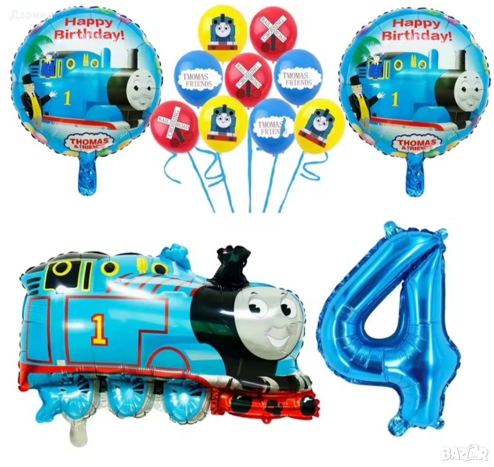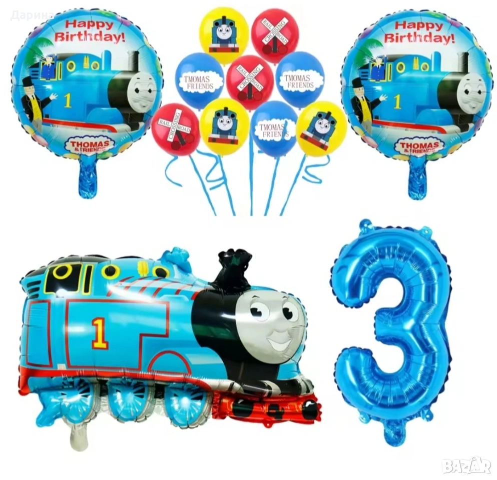 Парти сет балони Влакчето Томас - 13бр. балони: 1бр. влакчето Томас 66/52см., 2бр. кръгли балони 45см., 1бр. 9бр. латексови балони 30см. и 1бр. цифра 80см. от 1 до 5г. - 29.34лв./15€. Нови.