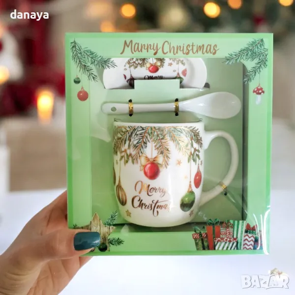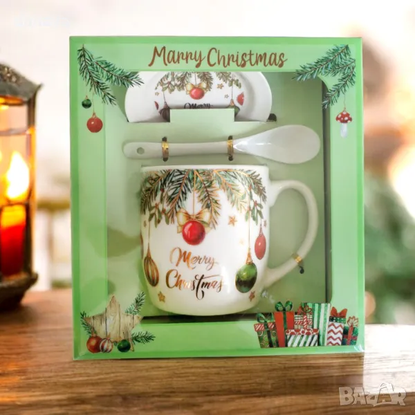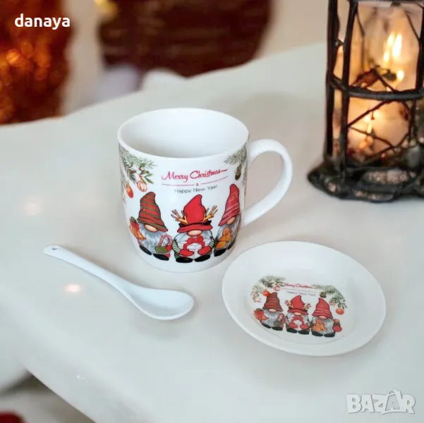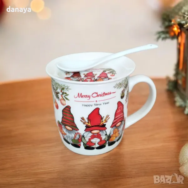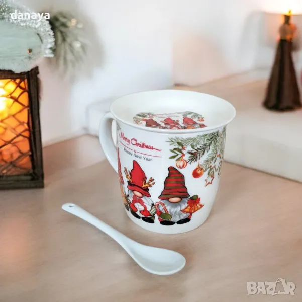 Красива бяла чаша за чай, кафе, мляко, капучино или други топли напитки с принт на коледна тематика. Чашата си има керамично капаче и керамична лъжичка за разбъркване. Комплектът се предлага в подаръчна коледна кутия. Чудесна идея за подарък за любим човек! Предлага се в два модела – с принт на гномчета и с принт на коледни клонки с шарени топки.
