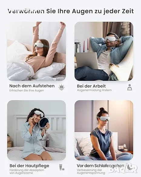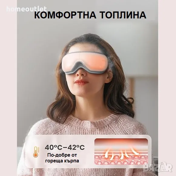 Вградените нагревателни подложки осигуряват комфортна температура от 40°C до 42°C, която влияе благоприятно при напрежение в очите, подути очи, сухи очи и др.