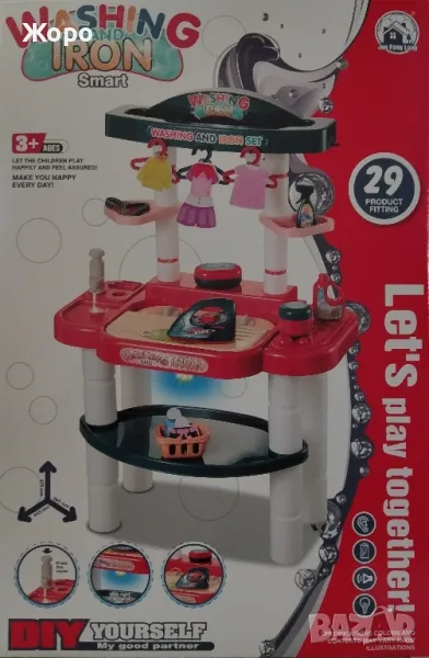 Комплектът включва 29 части ,които много лесно се сглобяват и създават масичка за пране с мивка с течаща вода и ютия и включват много перилни и почистващи препарати , прах за пране ,сапун ,веро и крем както и различни закачалки и дрехи , които позволяват на децата да симулират различни домакински домашни занимания