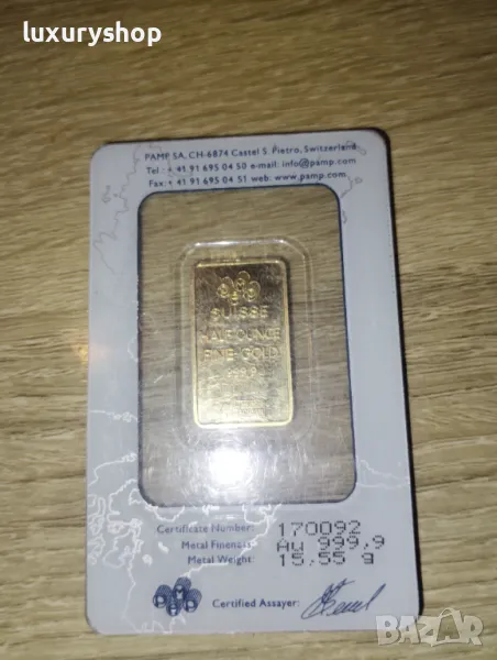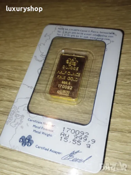 Лице: В горната част на кюлчето стои официалният печат на PAMP и текстът „SUISSE“.” В центъра на кюлчето е изписано „HALF OUNCE FINE GOLD“ и „999.9“, което означава 99.99% чисто злато или 24 карата. В долната част на кюлчето има печат на контролния орган, гарантиращ чистотата на златното кюлче и уникален сериен номер.
