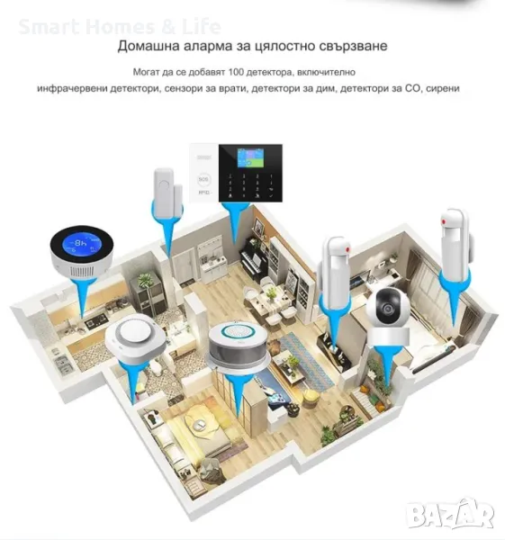 Контролният панел поддържа безжична връзка с обемни сензори за движение, магнитни датчици за врати и прозорци, детектори за дим,