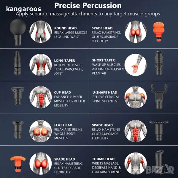 10 скорости и 10 масажиращи глави: Осигурени са 10 скорости за различни мускулни групи, подпомагащи масажа на възпалени мускули, отпускане и оформяне на различни мускулни части; избирайки от 10 различни по форма масажни глави, включете устройството, можете да започнете да отпускате частите на тялото си.