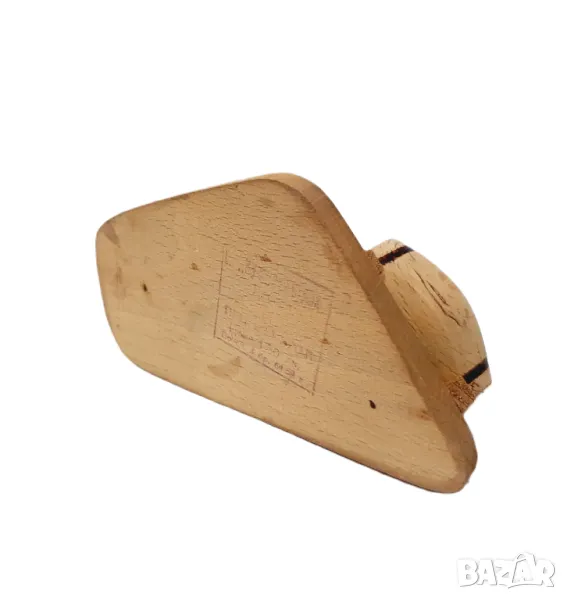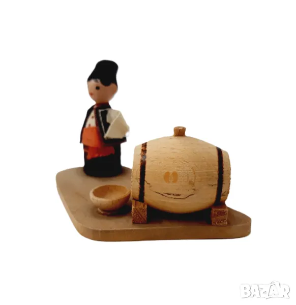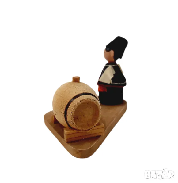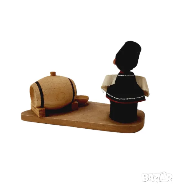 Дървената фигурка изобразява човек, облечен в народно облекло. Фигурата стои върху плоска основа и носи черна шапка, бяла риза с червени детайли и черни панталони. В едната си ръка фигурата държи нещо, което изглежда като пушка или дълго огнестрелно оръжие, опряно на рамото. В непосредствена близост до фигурата има малка дървена бъчва, разположена настрани, с отворен преден край, заедно с нещо, което прилича на малка купа или чаша. Майсторската изработка предполага, че тези предмети са ръчно резбовани и техният стил може да представлява културна или историческа сцена.