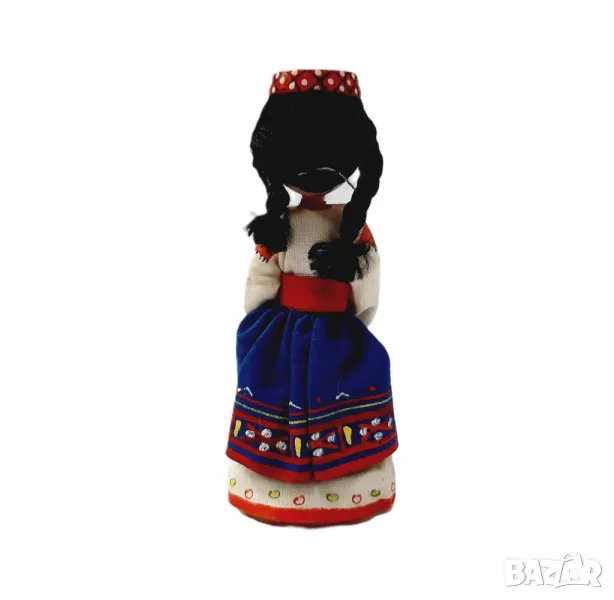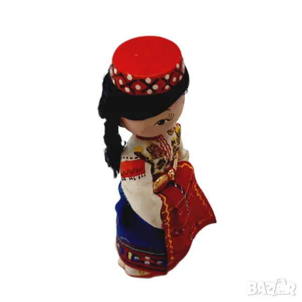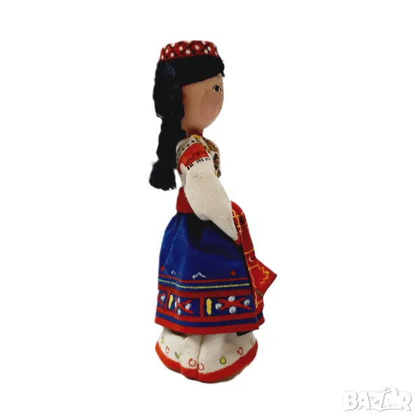 Куклата е висока 13см. Отличава се с традиционно облекло, включително червена шапка с бели и златни акценти. Многоцветната рокля демонстрира сложни шарки, с преобладаващо бели ръкави, украсени с червени и златни детайли. Корсажът е украсен с мъниста в златни, червени и зелени цветове, докато червената пола има златни гарнитури по подгъва. В допълнение, полата има декоративни елементи - пайети и мъниста - образуващи подобни на цветя шарки и геометрични фигури. Детайли, подобни на бяла престилка, покриват полата, също с орнаменти от мъниста. Очарователно представяне на народното изкуство.