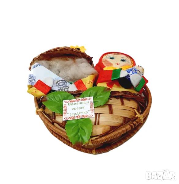 Етикет на кирилица: Малка правоъгълна картичка с текст на кирилица, който казва „Сърце на семейния амулет“.