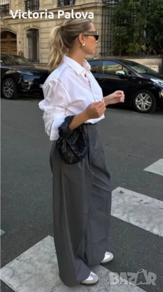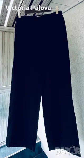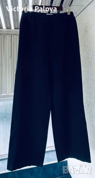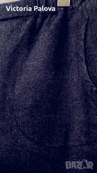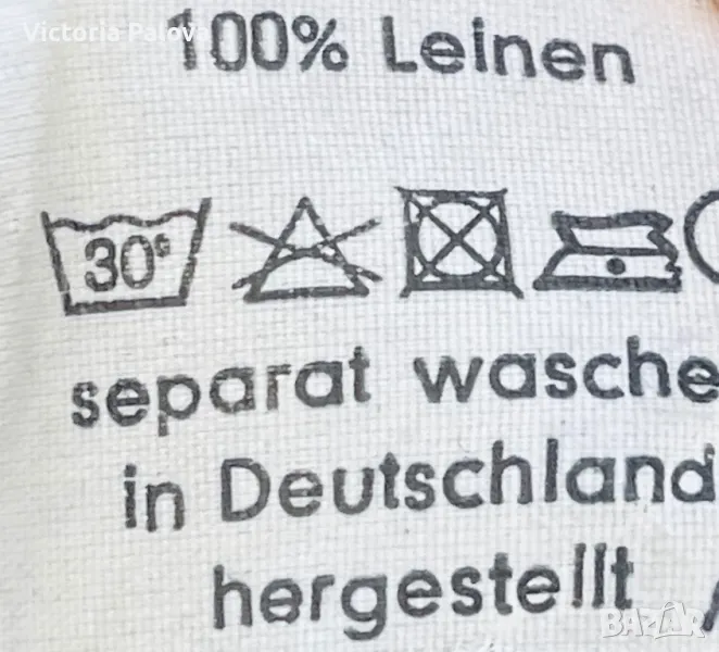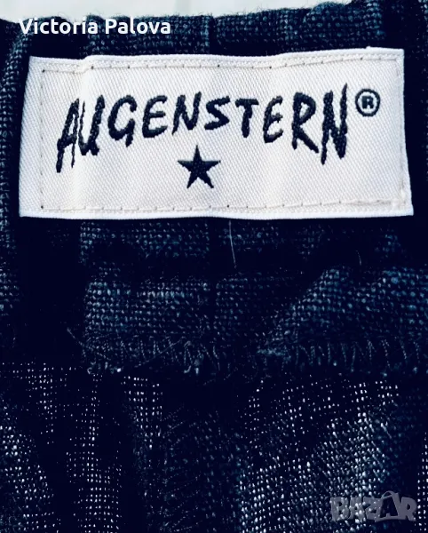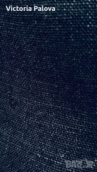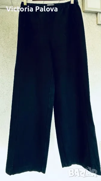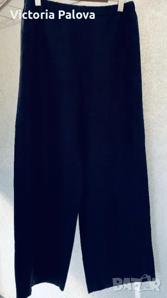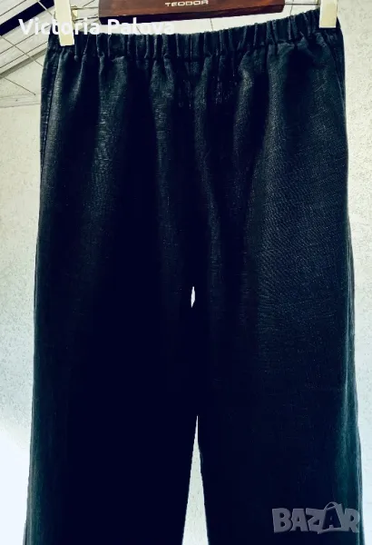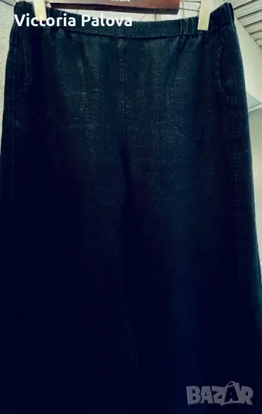 Панталонът е находка, груб тежък лен, не се мачка, пада тежко, широк крачол, лесно се поддържа и лесно се ползва - с ластик по талията ( освен отпред ), красиви кръгли джобове. Талия - 40-50см, цялата дължина - 104см, отвътре крачолът е 78см. Широчината му горе - 37см, долу - 28см.