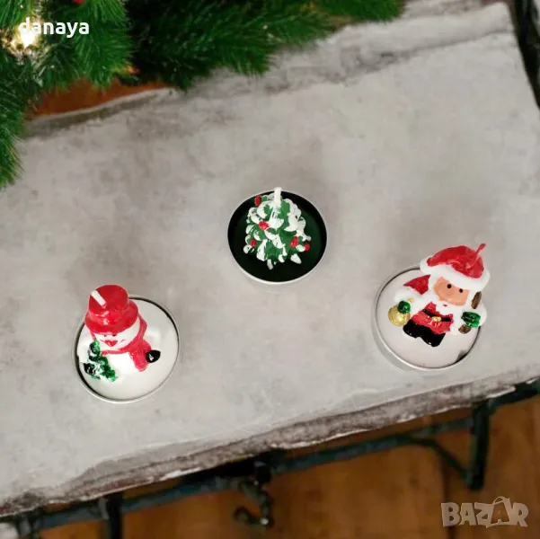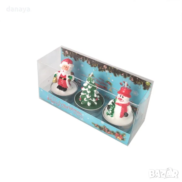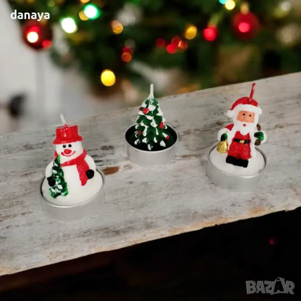 Комплект от 3 броя декоративни коледни чаени свещички с форма на Елхичка, Дядо Коледа и Снежен човек.