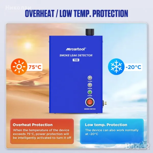 4 [Защита от прегряване и замръзване] Детекторът има интелигентен протектор. Ако надхвърли работната граница, например над 80 ℃. Той ще се изключи автоматично.