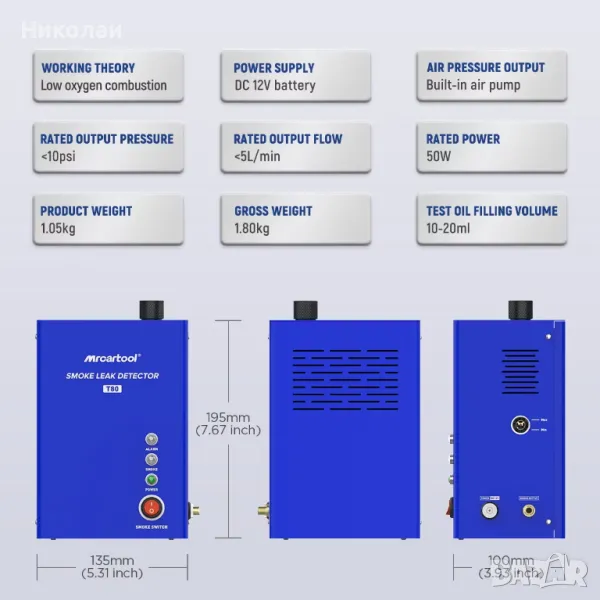 2 [Мощен и лесен за работа] MR CARTOOL T80 има собствена въздушна помпа, не разчита на друга въздушна машина, Свържете детектора с DC12V батерия, може да изведе много дим в рамките на 30 секунди след включване.