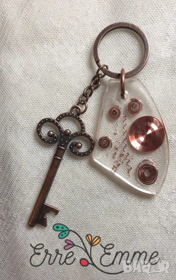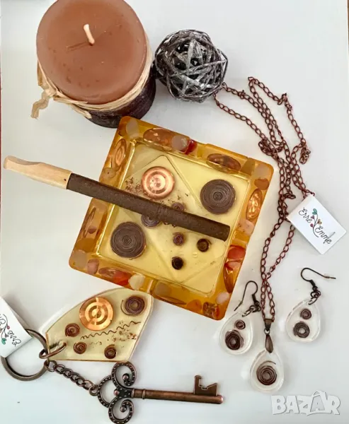Ръчно изработен от бижутерийна смола и вградени в нея медни елементи.