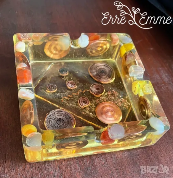 * Пепелник-оргонит (с вградени в смолата медни елементи и естествени кристали ахат). Размери 9 см на 9 см