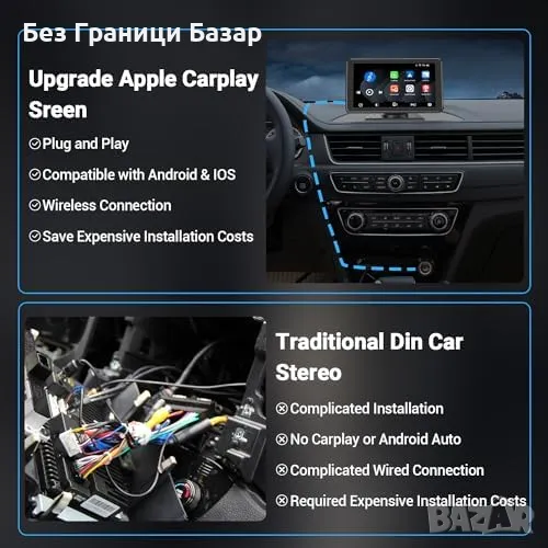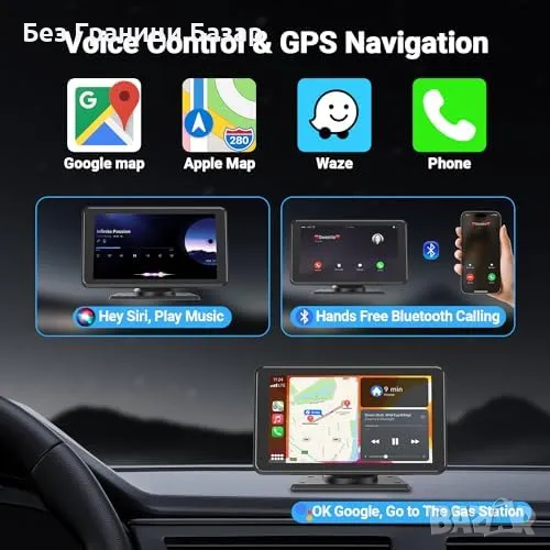 Нов HD 7" CarPlay/Android Auto екран с Bluetooth, FM, Гласов контрол