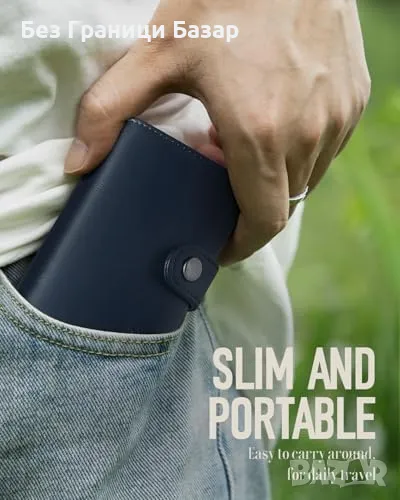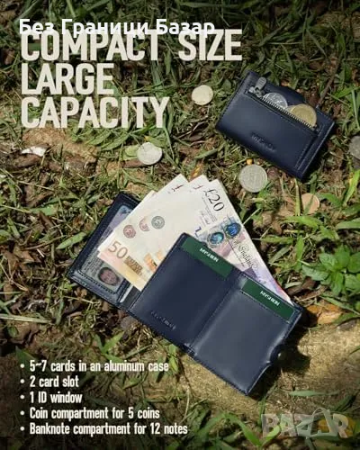 Компактен дизайн с голям капацитет: побира до 10 карти (5-7 в алуминиев калъф), 12 банкноти и 5 монети.