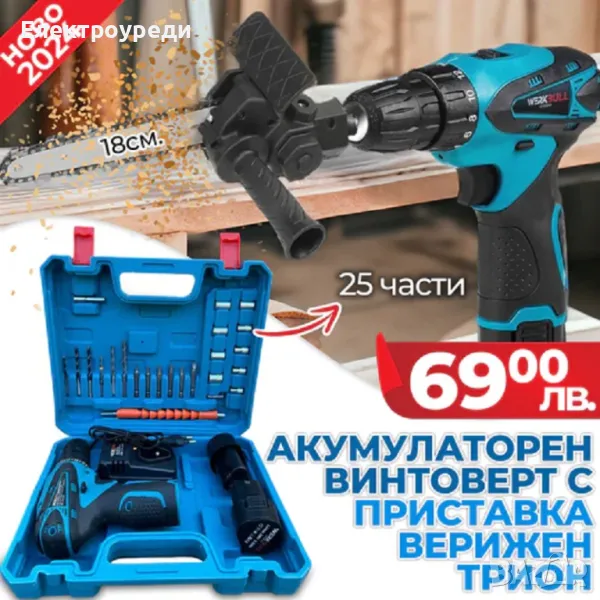 Новият продукт 2024г улеснява работата и спестява време, пари и нерви. Универсална Приставка за Винтоверт WerkBull е инструмент, който позволява да използвате вашия винтоверт и като резачка. Това ви позволява да превключвате за секунди между винтоверт и резачка. В комплекта е включен и предпазител, който влиза в полза на собственика, когато режете дървени греди или клони. Верижният трион с лекота може да отреже клон с диаметър 10см. С този преобразувател дори не е необходимо да купувате верижен трион, спестявайки пари и време. В сравнение с традиционните тежки електрически верижни триони, този моторен