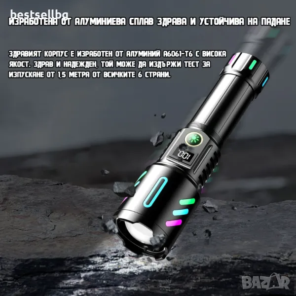 Мощно осветление: С 2000 лумена и далекобойност над 600 метра, фенерът осигурява изключително ярко и далечно осветление, което го прави идеален за различни приложения на открито, като къмпинг, лов, търсене и спасяване.