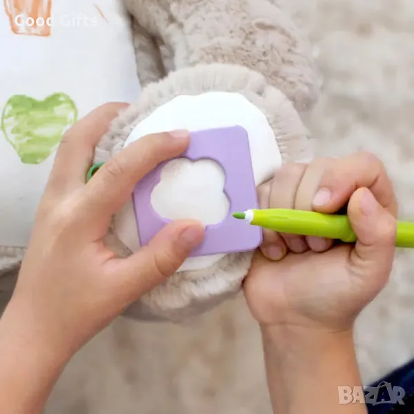 Коремчето, лапичките и нослето на мечето са изработени от специален материал, върху който може да се рисува: