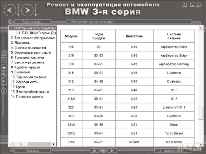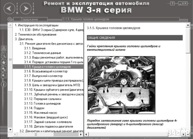 1.BMW 3 (E30) 1983-1994.Ръководство за експл.,ремонт и техн.обслужване.Съдържа изчерпателна техническа информация за модели 316,318,320,323 и325. Това ръководство включва стотици илюстрации и снимки, които показват местоположението на основните компоненти на автомобила и след това фазите на ремонтните работи. Отделни раздели на ръководството описват как бързо да диагностицирате неизправности и отстраняването им.