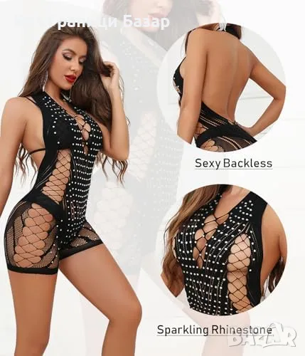 Секси дизайн: Прозрачно мрежесто боди с бляскави камъни, придаващи неустоим чар.