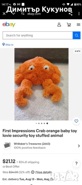 Забележка: В ebay същата играчка струва 21 долара= 37лв. Аз ще я дам за 30лв. Състояние: Чисто нова, без видими дефекти или следи от употреба.Размер: 23 см височина.Описание: Забавна плюшена играчка във формата на рак. Изработена от мек и приятен на допир материал, идеална за гушкане и игри. Тази весела играчка ще донесе усмивки на лицето на всяко дете и ще бъде чудесно допълнение към всяка колекция от плюшени играчки. Чудесен подарък за любители на морските животни и плюшените играчки.
