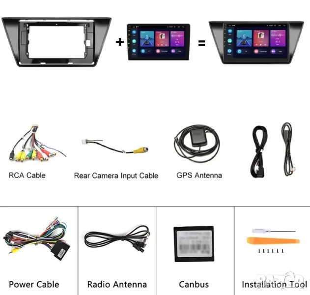 Пълен комплект с цялата рамка, преходни кабели и букси, декодери, предназначени и съвместими за монтиране на конкретния модел автомобил.